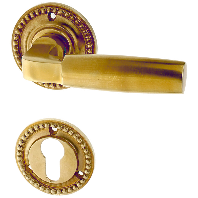 Rosettengarnitur mit PZ-Profilzylinder-Schlüsselloch. Egal, welchen Abstand das Schlüsselloch von der Türklinke hat, diese Garnitur passt in jedem Fall auch an Ihre historische Tür.