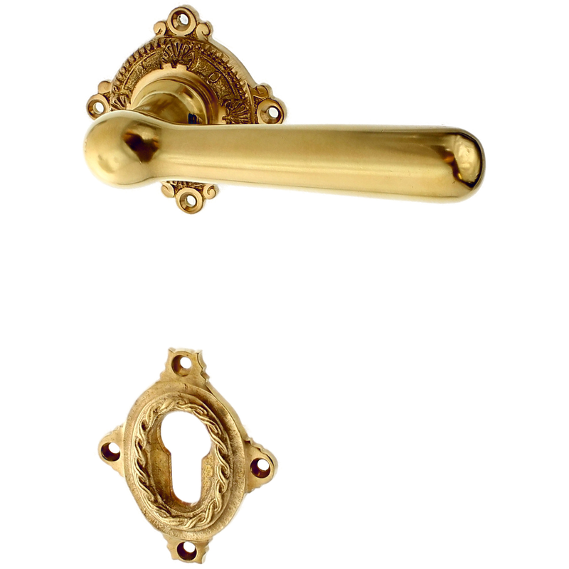 Rosettengarnitur mit PZ-Profilzylinder-Schlüsselloch. Egal, welchen Abstand das Schlüsselloch von der Türklinke hat, diese Garnitur passt in jedem Fall auch an Ihre historische Tür.