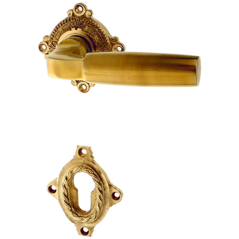 Rosettengarnitur mit PZ-Profilzylinder-Schlüsselloch. Egal, welchen Abstand das Schlüsselloch von der Türklinke hat, diese Garnitur passt in jedem Fall auch an Ihre historische Tür.