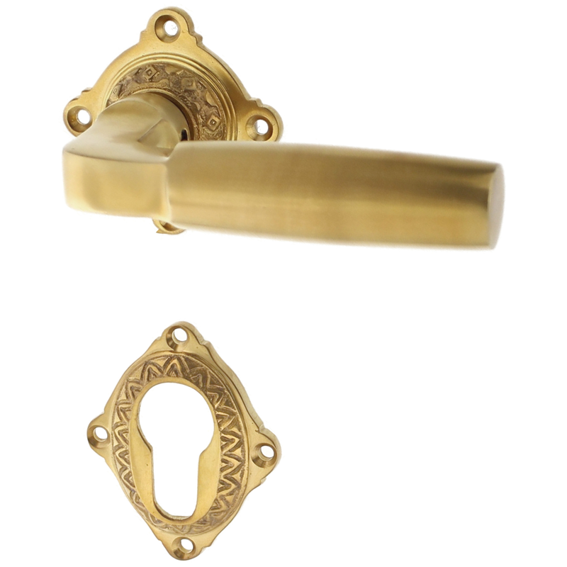 Rosettengarnitur mit PZ-Profilzylinder-Schlüsselloch. Egal, welchen Abstand das Schlüsselloch von der Türklinke hat, diese Garnitur passt in jedem Fall auch an Ihre historische Tür.