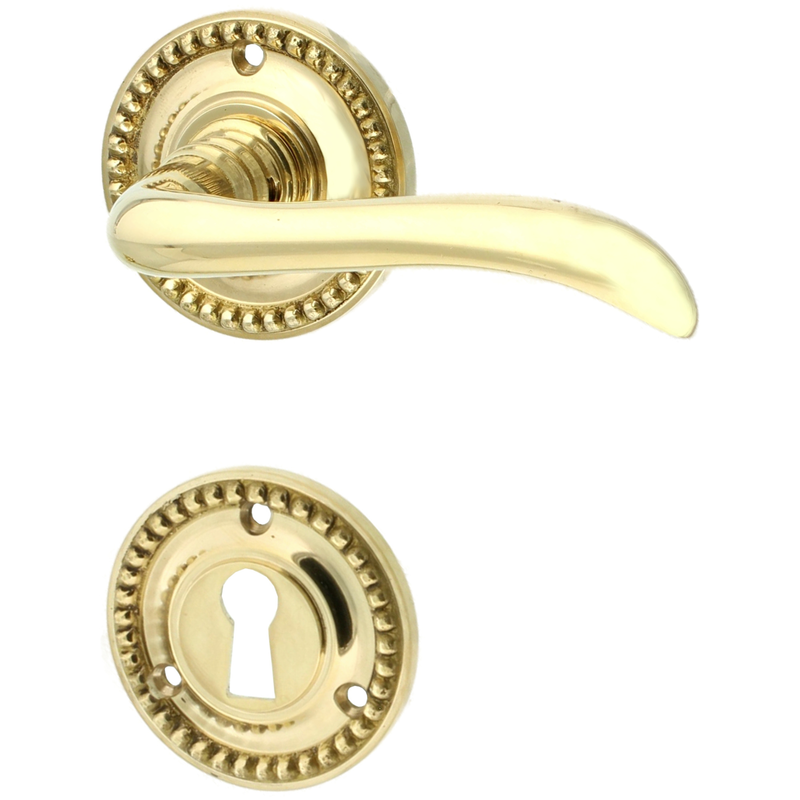 Rosettengarnitur mit Buntbart-Schlüsselloch. Egal, welchen Abstand das Schlüsselloch von der Türklinke hat, diese Garnitur passt in jedem Fall auch an Ihre historische Tür.