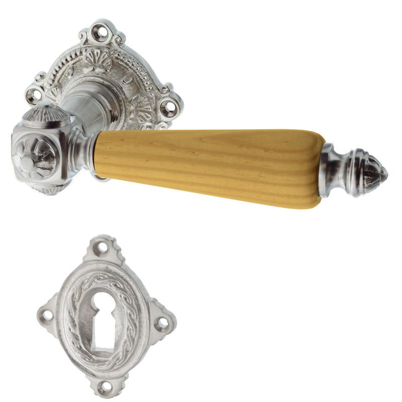 Rosettengarnitur mit Buntbart-Schlüsselloch. Egal, welchen Abstand das Schlüsselloch von der Türklinke hat, diese Garnitur passt in jedem Fall auch an Ihre historische Tür. Für WC-Verschlüsse bieten wir zusätzlich auch noch spezielle Einsteckschlösser an, falls Ihre Tür noch kein WC-Schloss hat. Schauen Sie bitte hier.