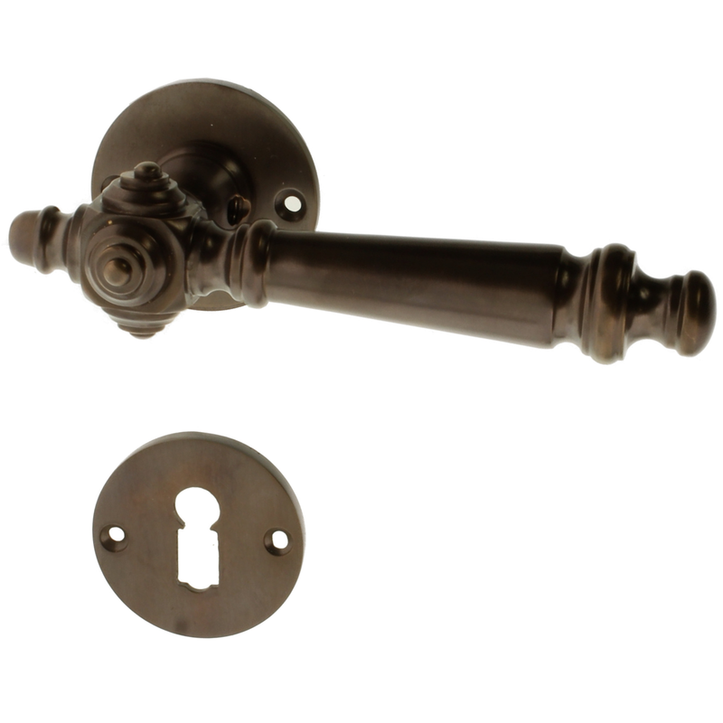 Rosettengarnitur mit Buntbart-Schlüsselloch. Egal, welchen Abstand das Schlüsselloch von der Türklinke hat, diese Garnitur passt in jedem Fall auch an Ihre historische Tür.