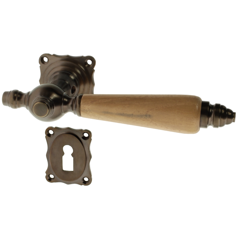 Rosettengarnitur mit Buntbart-Schlüsselloch. Egal, welchen Abstand das Schlüsselloch von der Türklinke hat, diese Garnitur passt in jedem Fall auch an Ihre historische Tür.