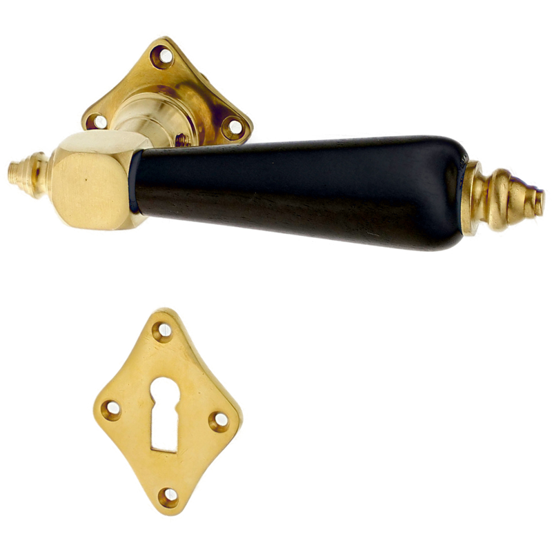 Rosettengarnitur mit Buntbart-Schlüsselloch. Egal, welchen Abstand das Schlüsselloch von der Türklinke hat, diese Garnitur passt in jedem Fall auch an Ihre historische Tür.