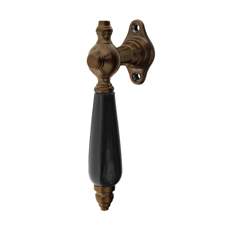 Handgefertigte Fensterolive - mit Griffhülse aus Holz, Porzellan oder Horn - aus dunkel patiniertem Messing - Modell "Gifhorn A"